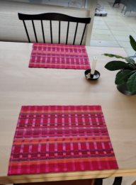Røde dækkeservietter i hør og bomuld. De er dobbeltvævede, og ligger derfor godt og "tungt" på bordet. Kan bruges både til jul og sommer. |